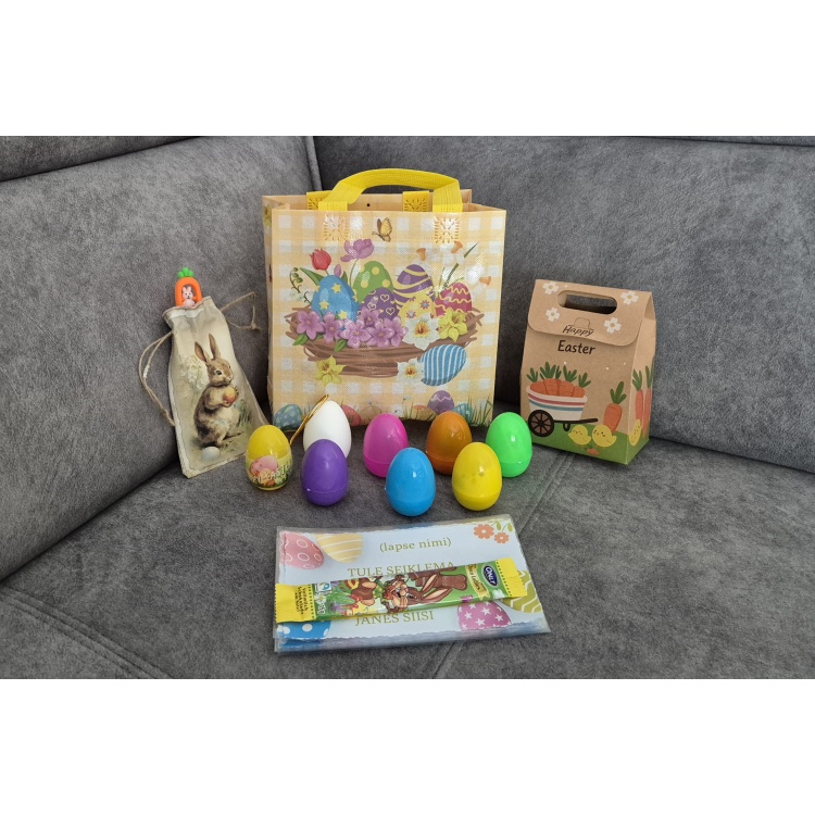Käepael, õhupall, dinosaurus, juukseklamber, kleebised, tattood, väikesed šokolaadimunad (3 tk) on munade sees. Geelpliiats on lihavõtteteemalises kotis.