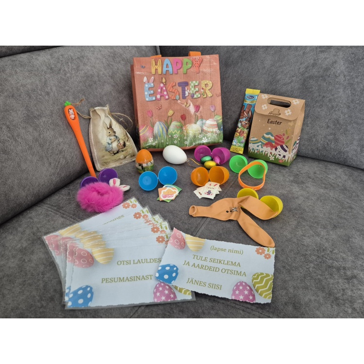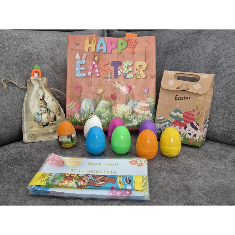 Käepael, õhupall, dinosaurus, juuksekumm, kleebised, tattood, väikesed šokolaadimunad (3 tk) on munade sees. Geelpliiats on lihavõtteteemalises kotis.